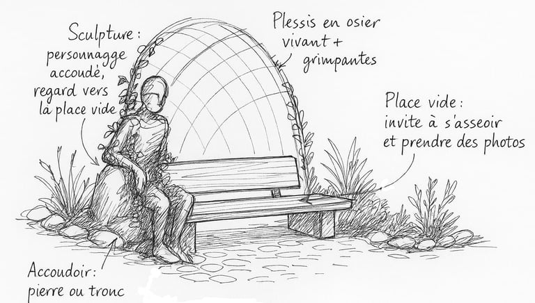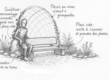 Modelée en ciment et fer à béton, une figure humaine enracinée dans un massif fleuri offrira un point d’appui, une présence bienveillante.